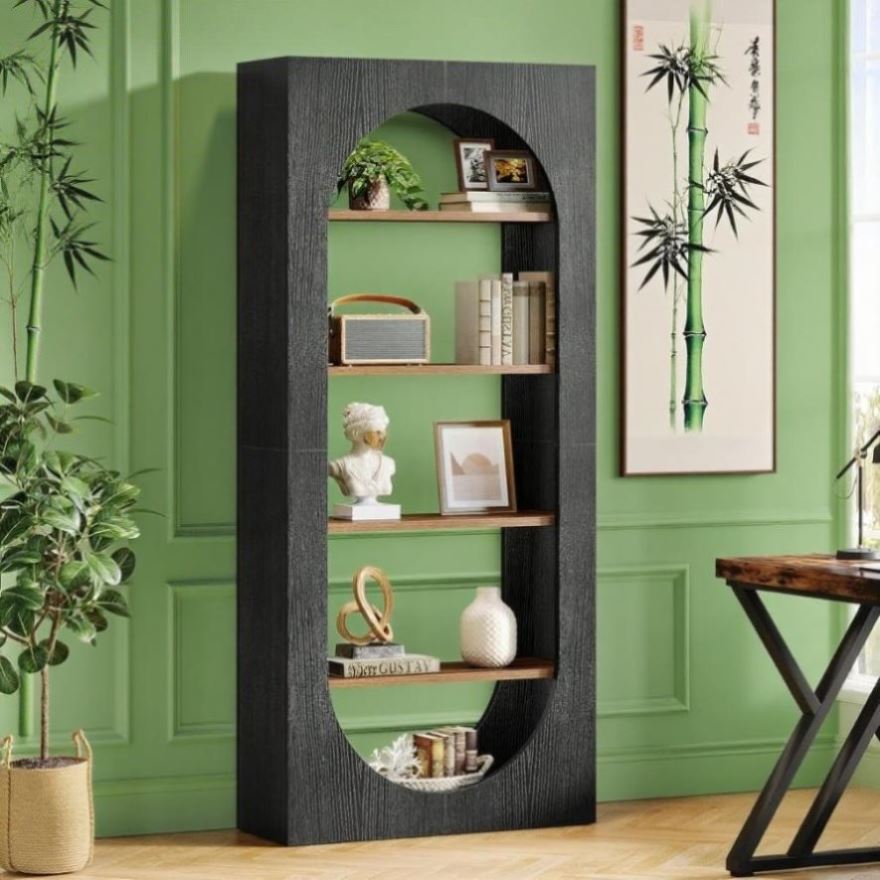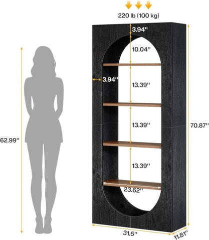Unique Arch Design: This black bookcase boasts an elegant oval arch front, seamlessly merging contemporary style with classic appeal. It serves as both a functional storage unit and a striking display shelf, ideal for elevating any space’s aesthetic
