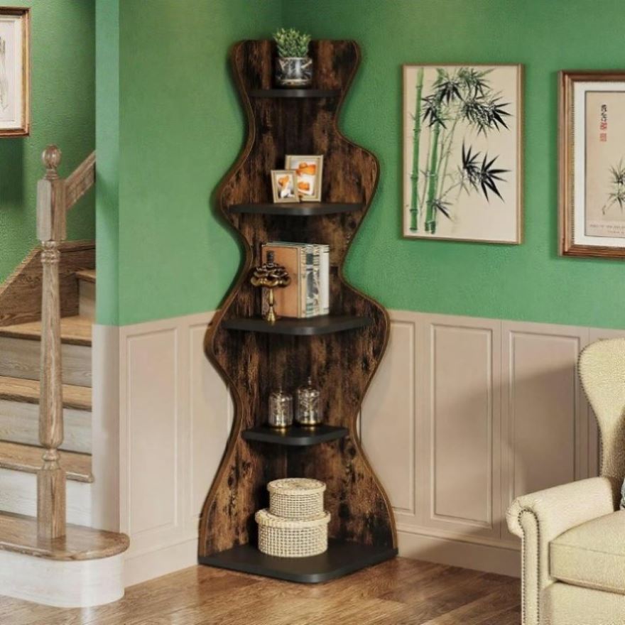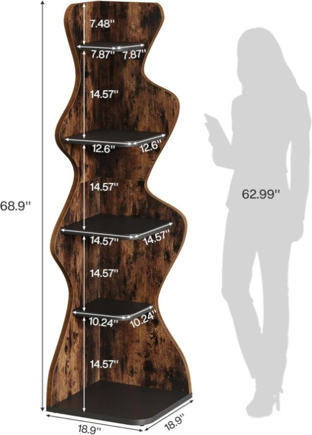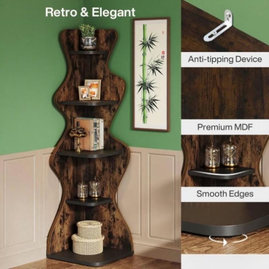 Rustic Elegance: Exhibiting rustic brown and black hues, this 5-tier corner shelf defines the perfect blend of traditional and modern aesthetics. The chic vintage look of the wood, combined with the streamlined shape, creates a calm and refreshing ambiance to your room, seamlessly integrating into any décor style