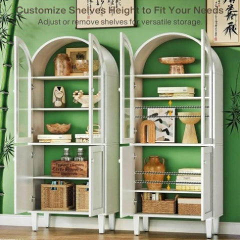 Ample Storage: With 5 tiers storage shelves, this tall arched display cabinet offers plenty of room for storing and displaying your belongings. Two of the panels are adjustable and removable, it allows you to customize to cater your different needs