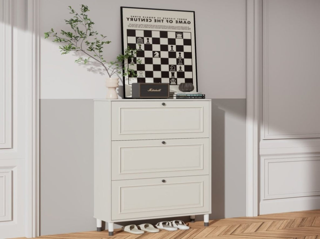 Smart Flip & Divide System:3 flip doors with dual-layer shelves (Upper:10.63" for flats & kids' shoes, Lower:11.42" for boots). Adjustable 2-position grooves allow 2" height customization. Bottom 4.7" clearance fits robotic vacuums