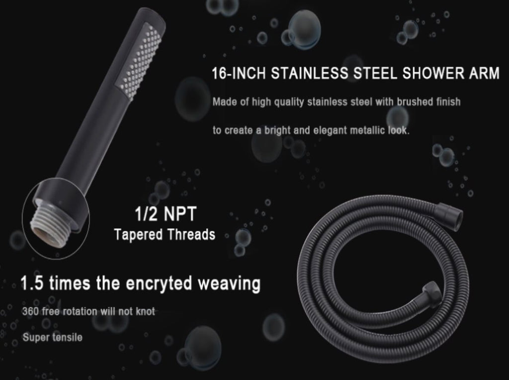 10.Item Package Quantity: 1 11.Included Components: Shower arm, rain shower head, handheld shower head, shower valve faucet, shower bracket holder, shower hose 12.Batteries Included No 13.Batteries Required No