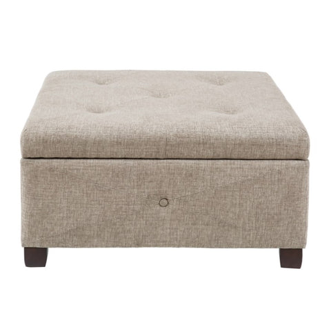 The Madison Park Aspen Ottoman offers a versatile storage option that’s full of style for your home. This square storage ottoman is upholstered in a sand color fabric and features button-tufted details on the top and sides that add an elegant touch. Solid wood legs with a dark brown finish complement the upholstery. Providing ample storage space for your blankets and other essentials, this upholstered ottoman makes a great addition to any room in your home. Assembly required.