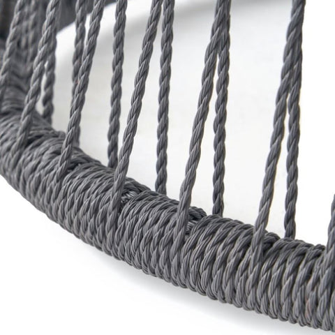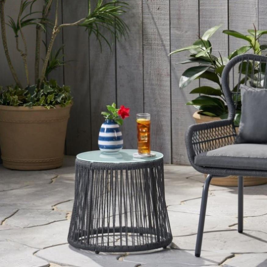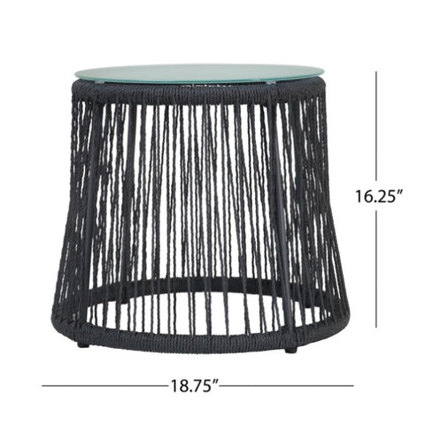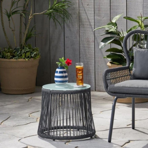 The perfect boho accent to any patio collection, this glass-topped end table is a unique combination of naturally-textured rope and a rugged iron frame. This versatile selection can serve as a rustic endcap for your favorite outdoor sofa or as a shared place to chat over hot coffee.