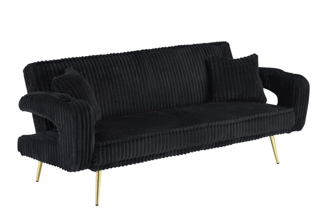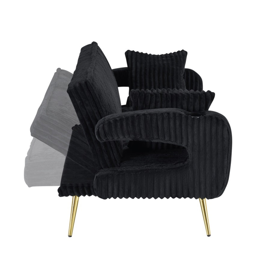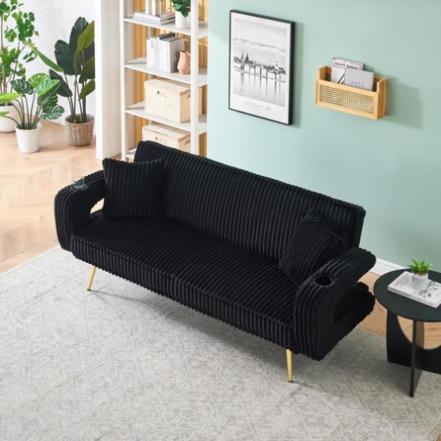 The black corduroy fabric has a low-key yet luxurious velvet texture that refracts a soft and elegant luster as the light changes The sofa has tea cup holders on both sides of the armrests, so you no longer need to worry about where to place your drinks; just lift your and place the cup securely. The backrest has three adjustable positions: the first position allows you to lean back slightly, stretching your spine; the second position increases angle, allowing you to sink deeper into the sofa, perfect for a lazy afternoon nap; the third position flattens the sofa into a soft bed, so you lie down comfortably when you're tired or sleepy. From daily relaxation to temporary rest, this sofa meets all your needs, supporting every bit of your laziness and. It's not just a piece of furniture, but a gentle remedy for a tired life.