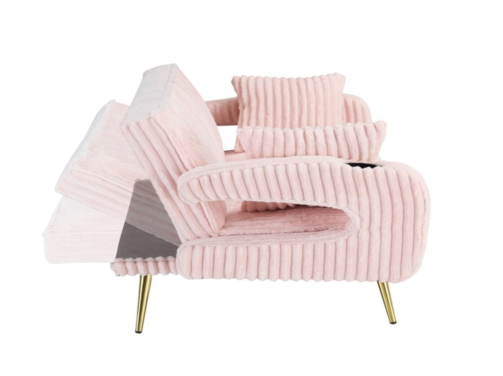 The dreamy pink color infuses the entire living space with a romantic atmosphere. Gently touching the surface of the sofa, the short dense corduroy feels soft and slightly elastic. On both sides of the sofa's armrests are cup holders, so you no longer need to worry about to place your drinks; with a simple lift of your hand, you can easily place the cup. Looking at the backrest, it is equipped with three-position function. With a light push on the backrest, you can easily switch your sitting posture: the first position is slightly reclined, allowing your spine to stretch the second position is at a greater angle, where your back is deeply nestled, making it the perfect angle for a lazy afternoon nap; the third position, with full push, instantly transforms the sofa into a flat, soft bed. When you're tired and sleepy, you can lie down comfortably and stretch your limbs. This corduroy sofa is far more than just a piece of furniture; it is a cozy companion through the long hours.