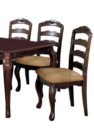 Product Description: The matching side chairs feature padded seats with a delicate floral motif. The ladder design back has soft, curvy lines instead of straight ones, while the front legs' use of Queen Anne style enforces this theme of delicateness. Product Features: Transitional Dark Walnut, Tan Fabric, Solid Wood, Wood Veneer, Others Ladder Back Design French Style Legs Padded Seats Floral Accents Includes 2 Pieces Per Box Product Dimension: Chair : 20 1/2"W X 23 1/2"D X 40 1/2"H Listing Include: Set Of 2 Side Chairs Only. Table is Not Included Simple Assembly Required.
