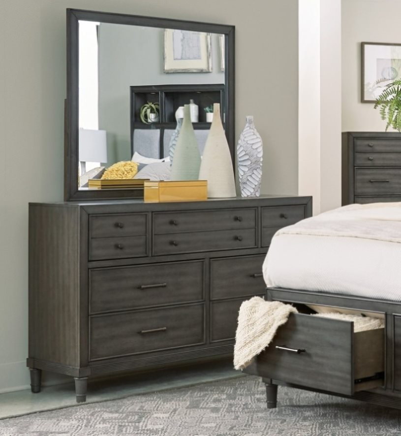 Modern convenience is paired with transitional style to create the versatile look of the Wittenberry Collection. The dressers gray finish over okume veneer is complemented by the dark bronze finished knob and bar hardware that fronts the framed drawers of the piece.