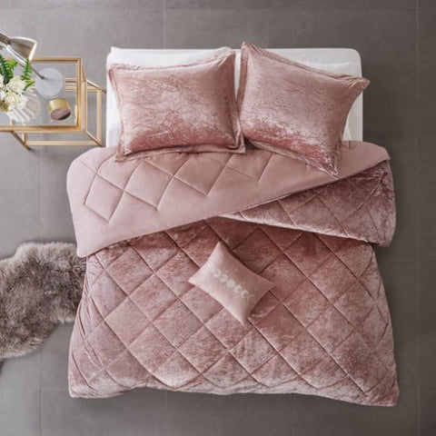 Create a lush and relaxing atmosphere in your bedroom with the Intelligent Design Felicia Velvet Comforter Set. The blush comforter is made from crushed velvet and features diamond quilting for a luxurious look. Matching crushed velvet sham(s) and an oblong decorative pillow complement the comforter to complete the modern style bedding set. Machine washable for easy care, this velvet comforter set uses hypoallergenic filling in the comforter and decorative pillow for extra softness and comfort. Feel the warmth and lustrous beauty of this velvet comforter set when you incorporate it into your bedroom décor. Items in the set may come in a rolled or compressed packaging, which will need to be fluffed up or steam ironed before use to remove wrinkles.