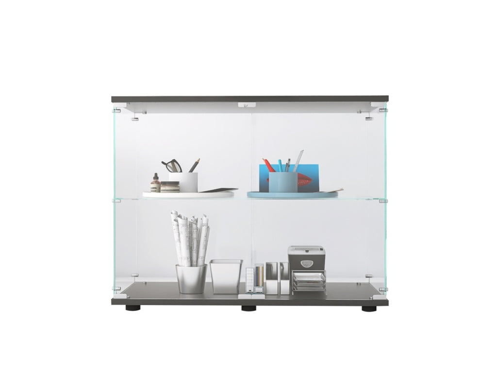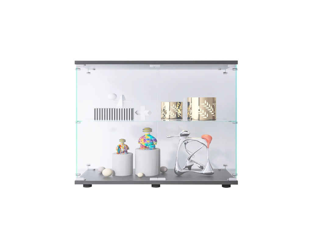 Two-door Glass Display Cabinet: Size 35.35"(H) x 31.69"(L) x 14.37"(W) inches, each tempered glass is 4mm thick. 2-shelf design is sturdy and stylish to display Jewelry, Bags, Shoes, Figures,photos, books, action figures, wine and whisky; glass door is easy to open and close.