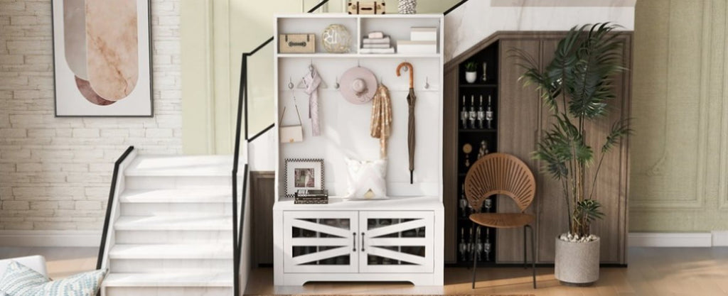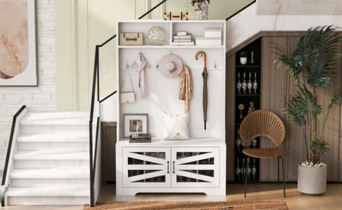 Displaying exquisite decorations, the two spacious shelves on the upper level serve their purpose perfectly. Hanging clothes, scarves, bags, and other daily necessities with ease, the seven sturdy and durable hooks equip the space, enhancing organization in your life. Providing unprecedented ease and fun when putting on and taking off shoes, the comfortable shoe bench transforms every entry and exit of the house into a pleasure.