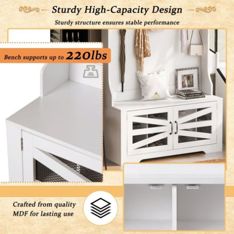 High-quality MDF comprises the hall tree, assuring its durability and longevity. The sturdy design guarantees long-term stable performance. Supporting a weight of up to 220 lbs, the bench facilitates the reliable accommodation of diverse items with ease.