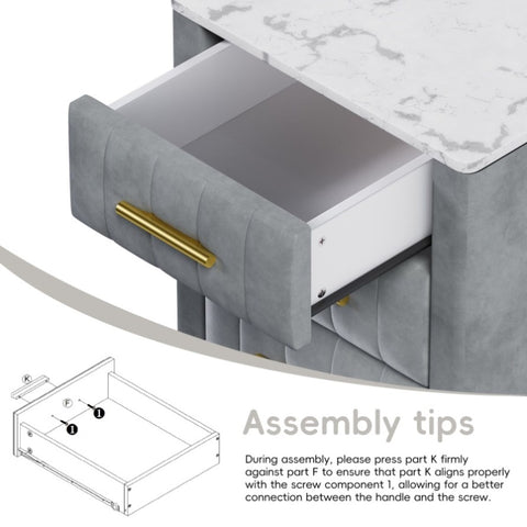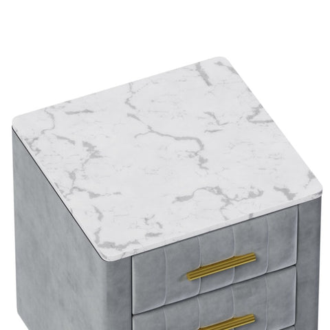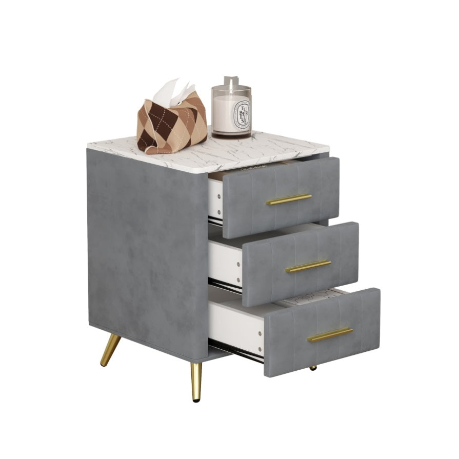 Upholstered Nightstand with 3 Drawers and Metal Legs&Handles,Bedside Table with Marbling Worktop