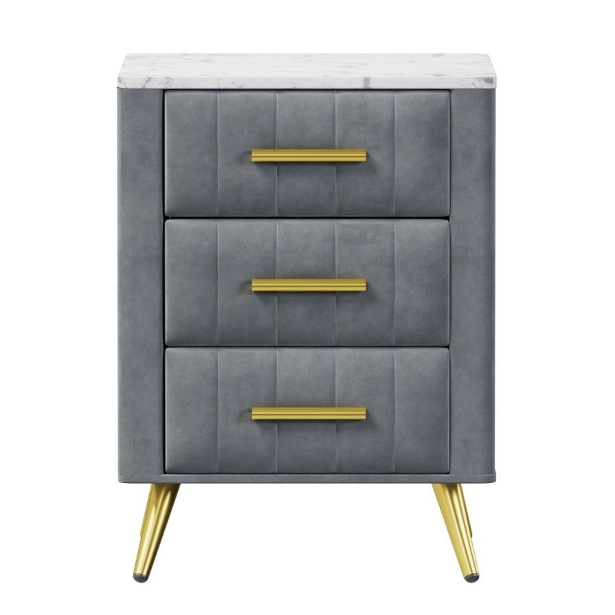 Upholstered Wooden Nightstand with 3 Drawers and Metal Legs&Handles, Bedside Table with Marbling N733P208520E