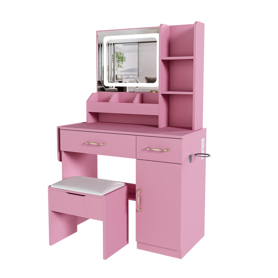 Ultimate Convenience: Built-in Power & Expandable Space:Experience unparalleled convenience with a built-in power outlet that includes two USB ports and two AC sockets, allowing you to charge your devices and power your beauty tools simultaneously. The added hairdryer holder on the side keeps your tool handy and safe. Furthermore, the innovative drop-leaf countertop can be expanded when you need extra surface space and folded away neatly to save room, making this vanity both versatile and space-