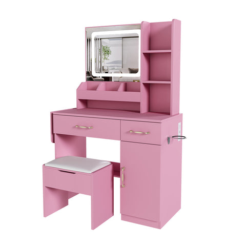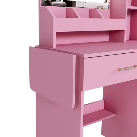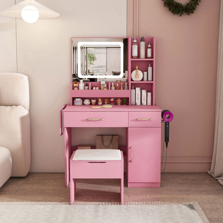 Massive & Smart Storage Capacity:This vanity desk is a storage powerhouse, designed to declutter your space and organize your entire collection. It comes with a hollow storage stool for larger items, two spacious drawers, six open shelves for daily essentials, and a cabinet featuring an adjustable shelf for maximum flexibility. The wider tabletop provides ample room for all your beautifying tasks, ensuring everything you need is neatly stored and within easy reach, helping you create a visually
