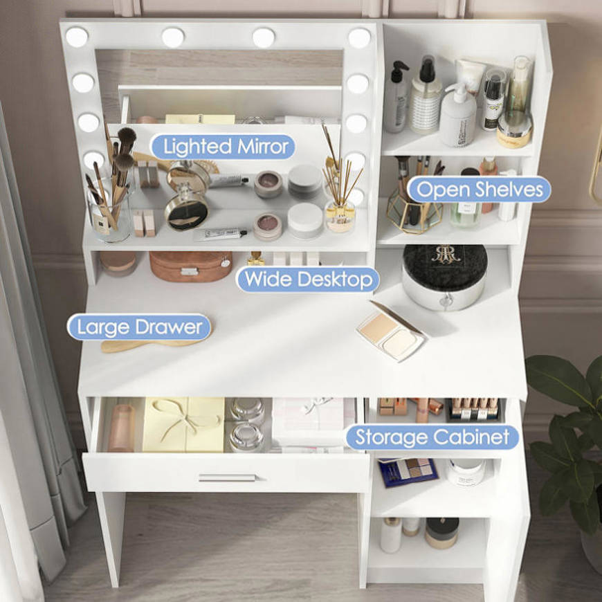 Spacious Storage: This dressing table set includes one oversized drawer, three shelves, and three levels of cabinets. All your makeup and skincare products can be neatly organized on the dresser, bidding farewell to small, cluttered desks and enhancing your daily life.