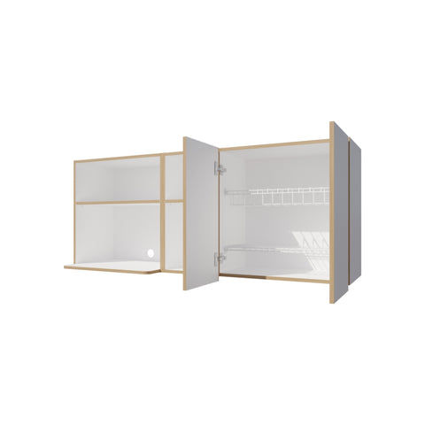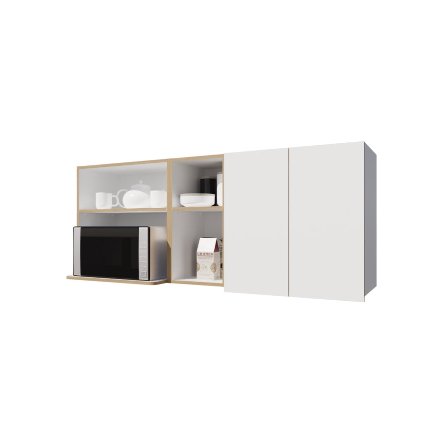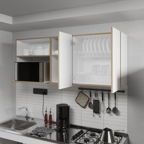 "This wall-mounted kitchen cabinet provides a practical and stylish solution for organizing utensils and appliances. It features a dedicated microwave compartment, two open shelves perfect for decor or storage, and a closed compartment with double doors for plates and tableware. Its modern design combines high-quality melamine finishes with a sturdy frame. Ideal for maximizing space in small to medium-sized kitchens.