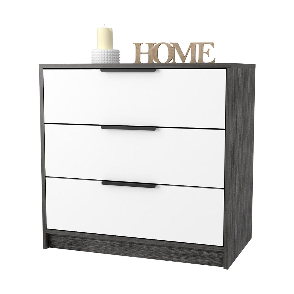 "Beautiful rustic-contemporary Washington white chest of Beautiful rustic-contemporary Washington white chest of drawers suitable for any interior decoration, be it in the bedroom, bathroom, kitchen, or living room. Its design gives a minimalist touch, especially for people who want to give light to their spaces. It has a delicate surface to superimpose decoration elements, consoles, and everything you need for daily living. This dresser is designed for you, beautiful, optimal size, and thanks to its three large drawers, you can store clothes, bedding, or general storage. Our Washington 3 three-drawer dresser is a fantastic stand-out piece. Featuring three spacious drawers with black handles, all-metal hardware, and an exquisite finishes combination will make this piece stand out in your bedroom. Product dimensions are 27.5"" W x 16.2"" D x 27"" H Made of engineered wood with a Smokey Oak frame and white drawers. "