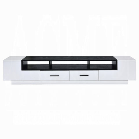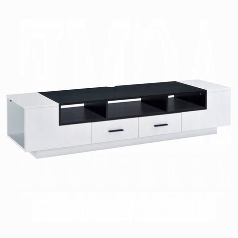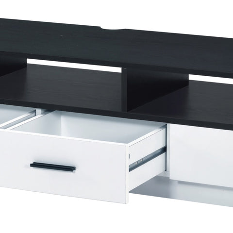 The storage unit combines five open compartments for ample display and organization space with two drawers for concealed storage of smaller items and accessories. It can accommodate a maximum recommended TV size of 70" flat screen for optimal viewing, supported by a wooden cabinet base that provides sturdy support and a classic, elegant appearance.