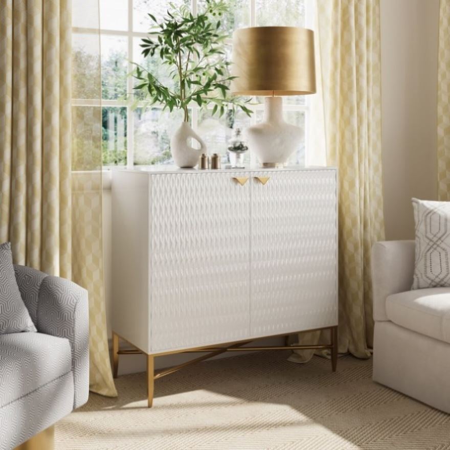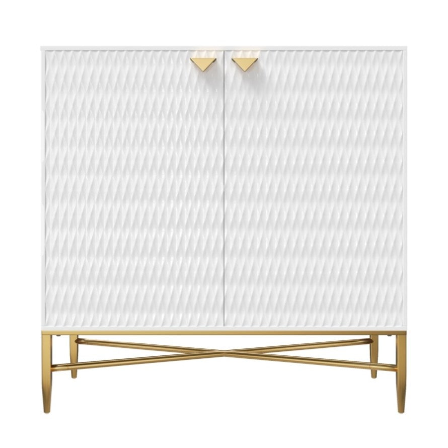 Modern accent cabinet with smooth surface, clean lines & raised diamond pattern.