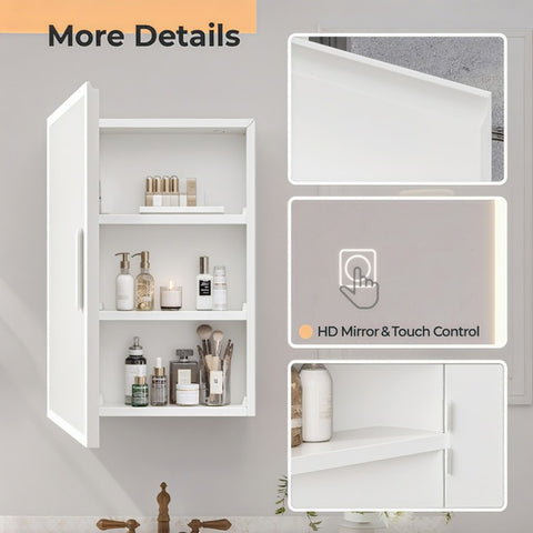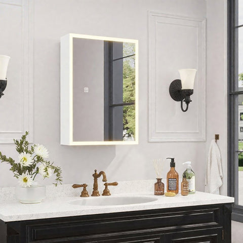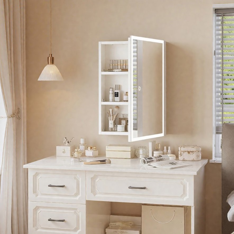 Introducing our modern LED mirror cabinet, designed to combine functionality with sleek aesthetics. Crafted from durable white particle board and framed with elegant acrylic edges, this cabinet measures 71*50.8*15cm, making it ideal for bathrooms or vanity spaces. It features a single door, two adjustable shelves, and energy-efficient LED lighting with three-color temperature options (warm, natural, and cool white). The built-in dimming function allows you to customize brightness levels, while the power-off memory ensures your preferred settings are retained. Designed for versatility, the door can be mounted on either the left or right side. With a compact packaging size of 83*63.5*14.5cm and a net weight of 12.8kg, this mirror cabinet offers practical storage and premium lighting in one stylish unit.