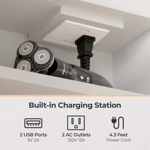 - Function:Time & Temperature Display, Three-Tone Lighting, Adjustable Brightness, Power-Off Memory, 2 Built-in Plugs, 2 USB Ports, US Socket LED Cabinet for Storage