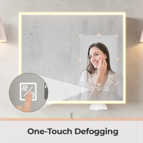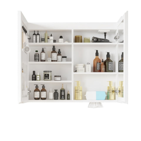 The FCH white particleboard LED mirror cabinet is an outstanding choice for your storage needs. Measuring 32*28 inches, it features an acrylic frame, double doors, and 7 shelves. With functions like time & temperature display, three-tone lighting, adjustable brightness, power-off memory, defogging, along with 2 internal plugs and 2 USB ports (US socket), it combines practicality and convenience. It's perfect for keeping your items organized while adding a touch of elegance to your space.