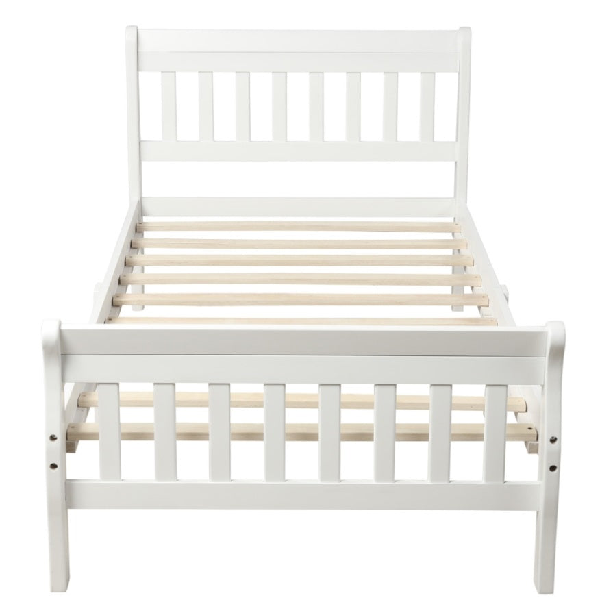 This Wood Platform Bed with Headboard & Footboard is a minimalist, stylish bed base that works well with a variety of decorating styles and makes it easy for you to beautify the look of your bedroom. The bed contains an integrated headboard & footboard. It fits most Twin-size mattresses and does not require a box spring. This bed frame is an excellent addition to any bedroom, do not miss the chance take it home.