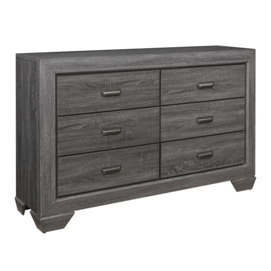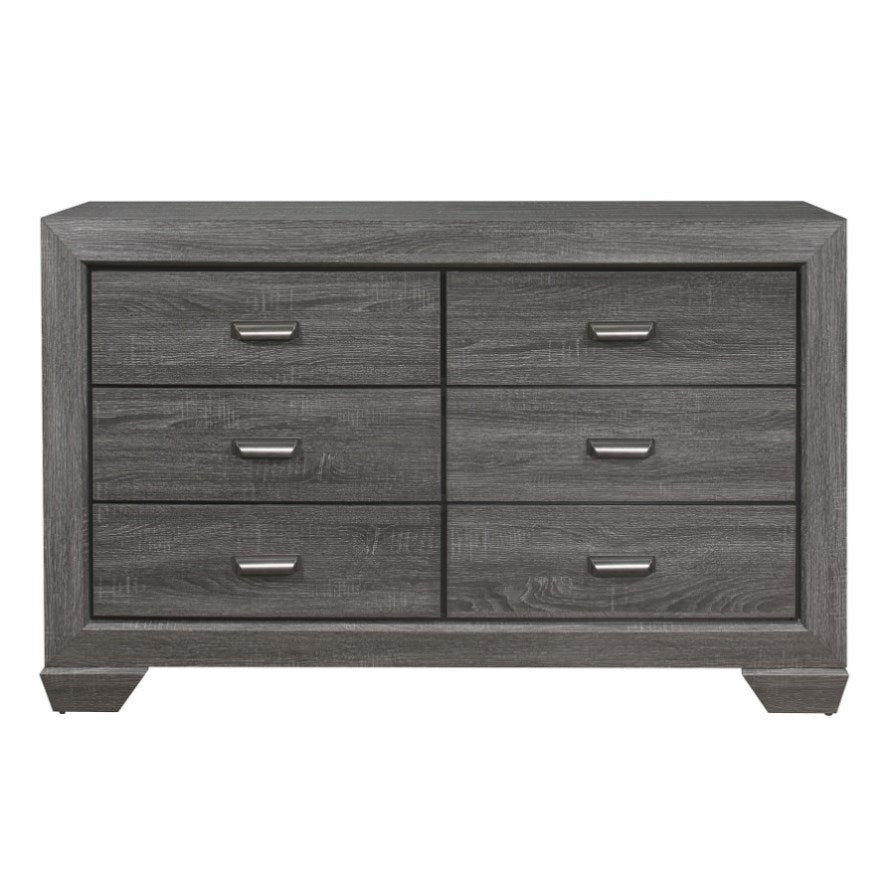 Blending the elements of contemporary design and rustic aesthetic, the Beechnut Collection is a unique addition to your bedroom. Dark under-paneling serves to highlight the gray finish enhancing the embossed faux-wood veneer of the dresser's drawer fronts. Contrasting cup hardware punctuates each drawer front.