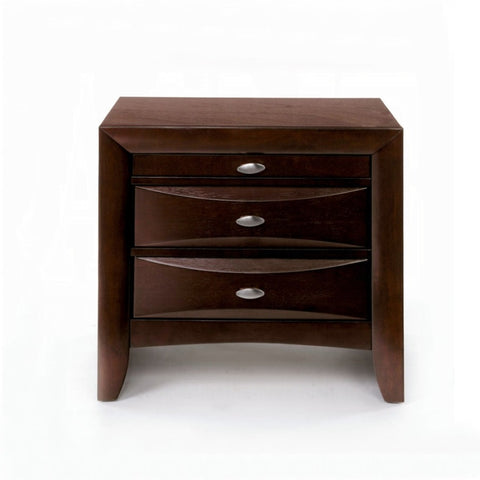 The elegant and durable nightstand in espresso finish keeps essentials close by with 2 storage drawers and 1 pull-out tray. Pull-out tray offers you additional surface area. Drawer fronts are beveled and all drawers have English dovetail with center metal glides. Complemented by slightly flared square legs, this features a contemporary feel.