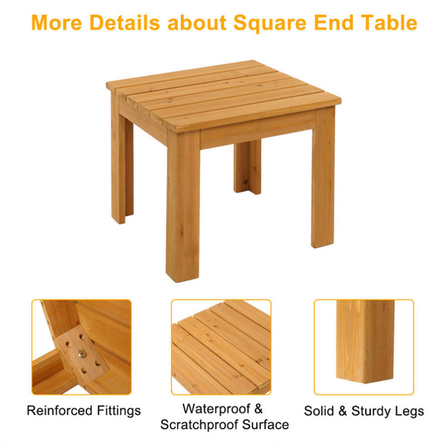 The Wooden Square Side End Table is made for the outdoors. Its natural color easily blends in with any environment, making it a perfect finishing touch to your outdoor space. The table features a slatted top that allows rain to run through when left outside during rainy days. Constructed of high quality fir wood with varnish on the surface, it is waterproof, weather resistant and scratch resistant. And it is easy to clean just with a damp cloth. It is also a wonderful choice to be placed beside your sofa or bed.Features: