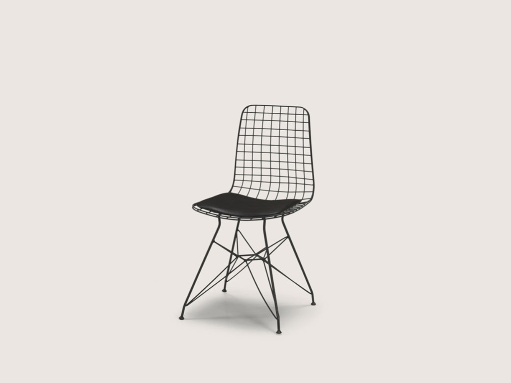 he sleek lines and open-grid design make it a stylish addition to any contemporary dining space. A comfortable seat cushion enhances everyday usability without compromising on design. Perfect for modern kitchens, dining rooms, or cafés, it adds a touch of sophistication to any setting. The black powder-coated finish resists wear and ensures easy maintenance.