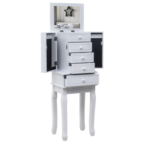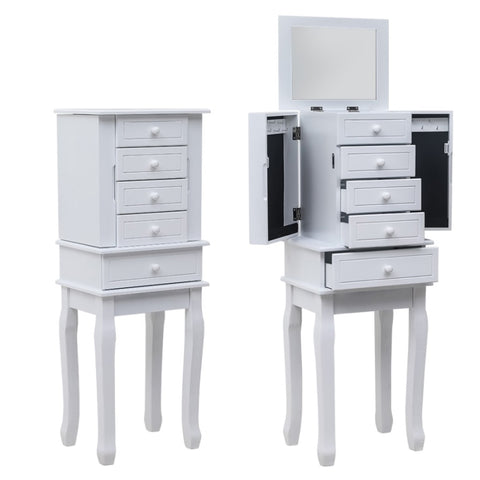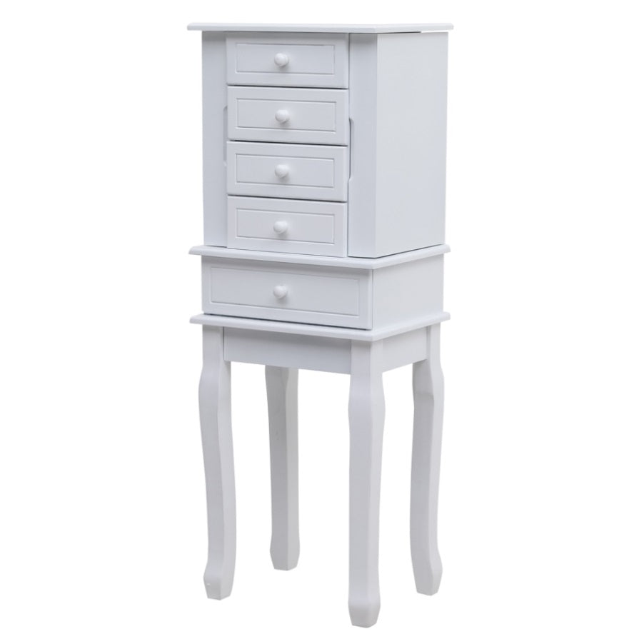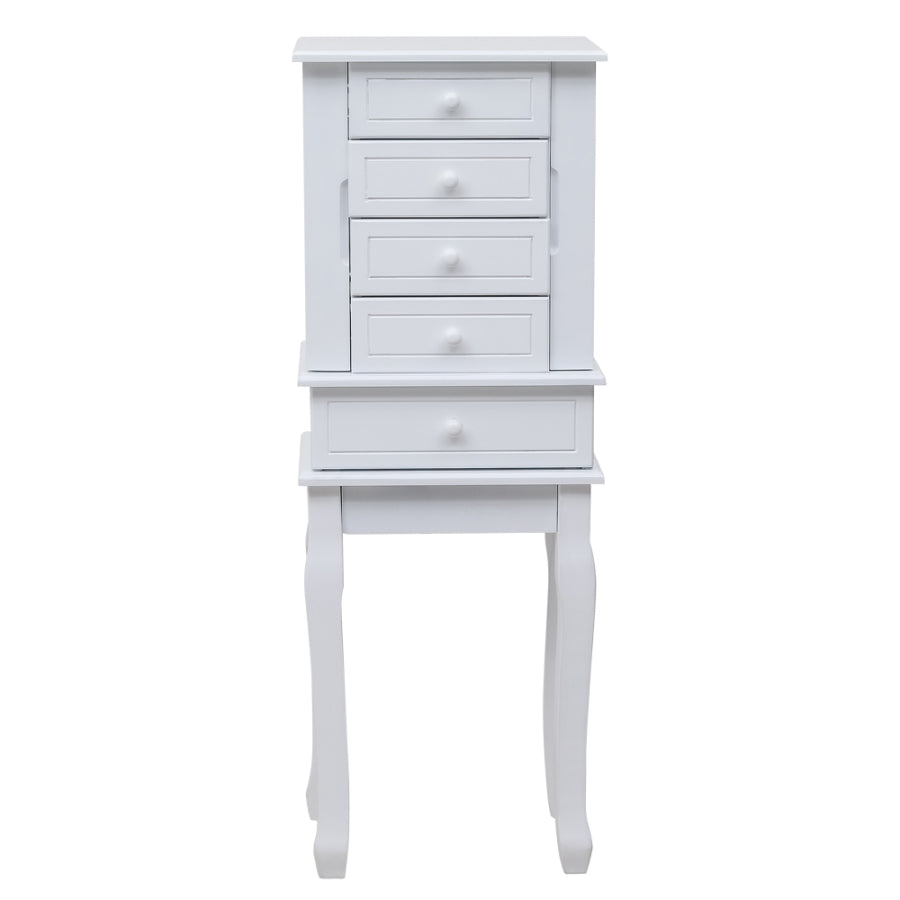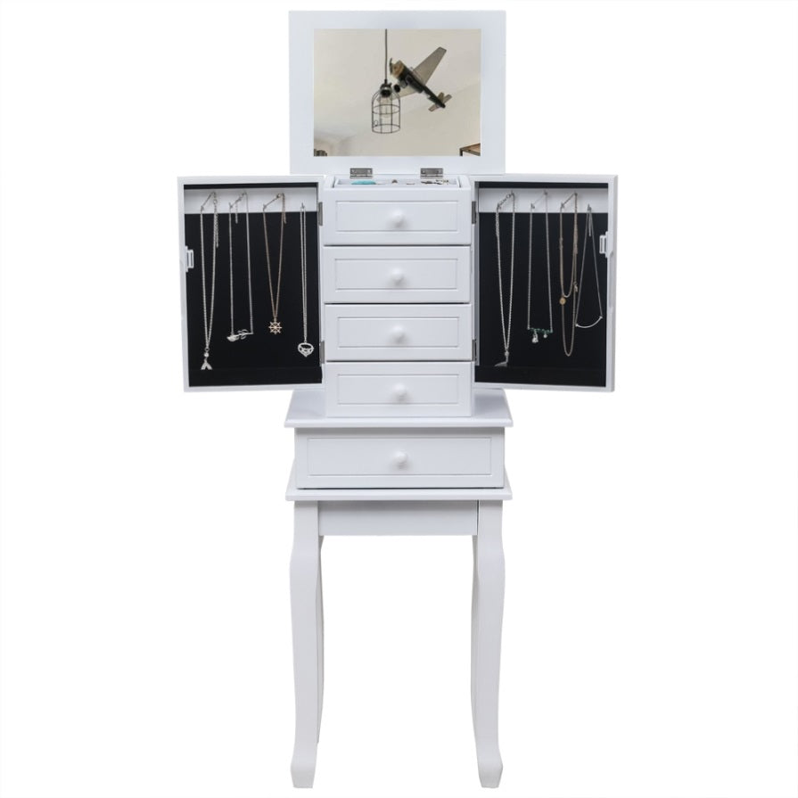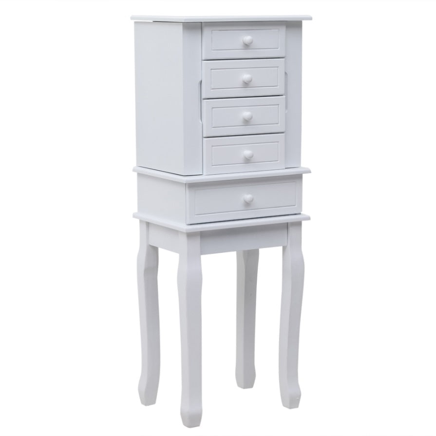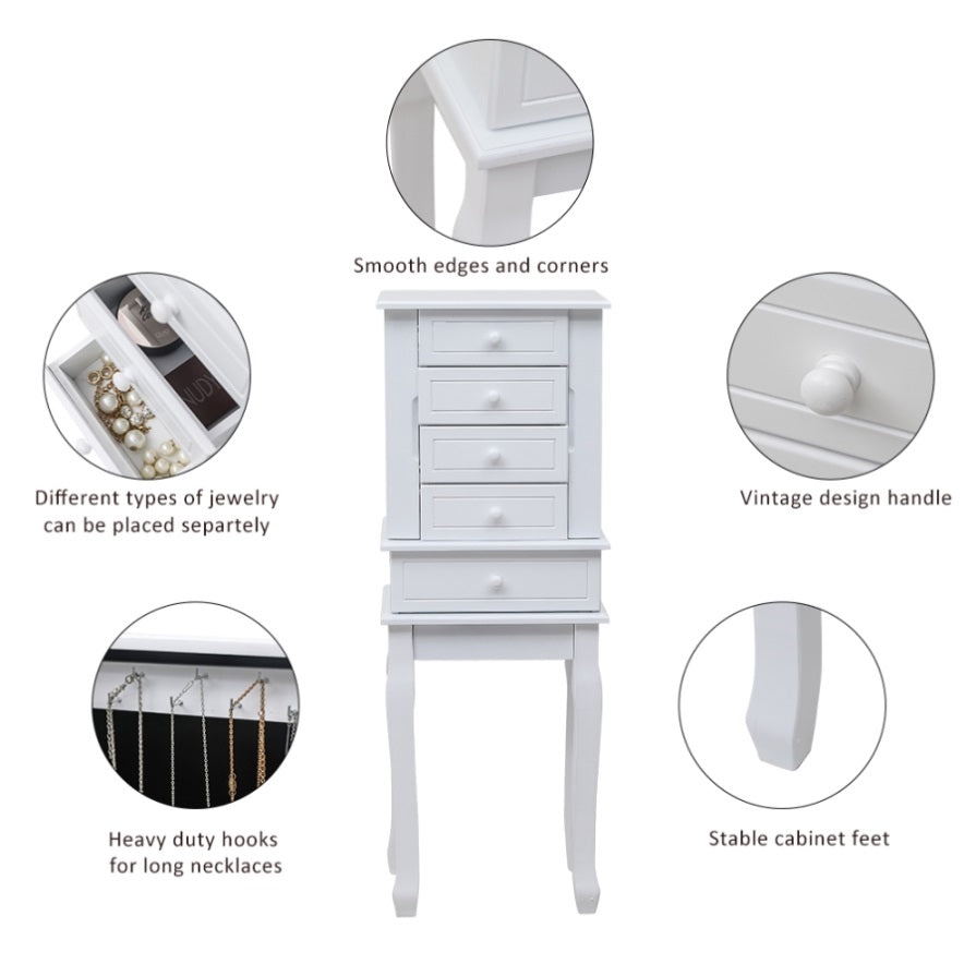 With classic and smooth lines, this jewelry cabinet is extremely attractive and functional. It can be perfectly matched with any decoration. While ensuring the elegant appearance of the product, we also have strong protection and safety. One is the black lining to prevent your jewelry from being scratched and scratched. In addition, the anti falling design on the back can prevent the product from falling and hurting children. There are five drawers, four medium-sized and one large drawer to meet different placement requirements. With a mobile ring storage box at the top, it is convenient and flexible. The perfect drawer size is enough to meet your daily storage requirements for various items. There are 14 hooks on the two side doors of the jewelry cabinet, which is an excellent storage location for your necklace accessories. The hooks we choose are of simplicity style appearance and durable material, which can set off your jewelry's high quality. High quality MDF material and solid wood legs make this jewelry armoire durable and sturdy. The design of the tall legs is also relatively easy to move. It does not directly touch the ground and prevents moisture, which increases the service life of the cabinet.