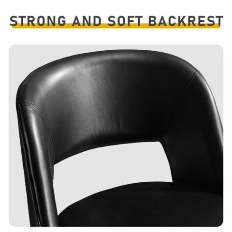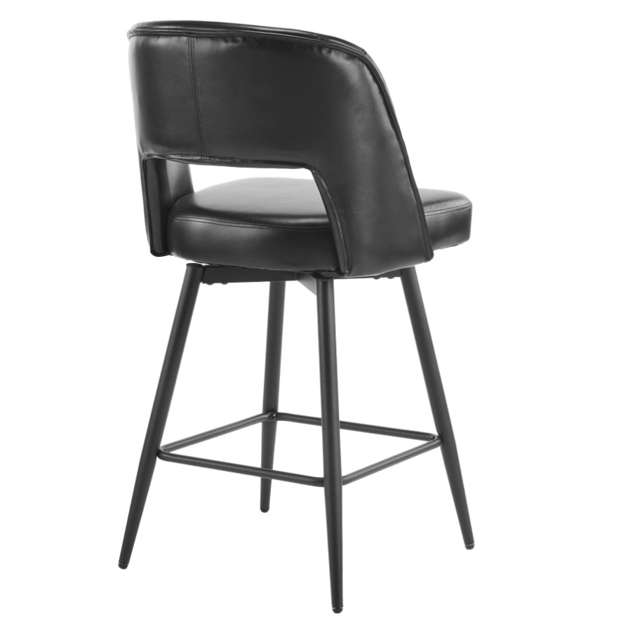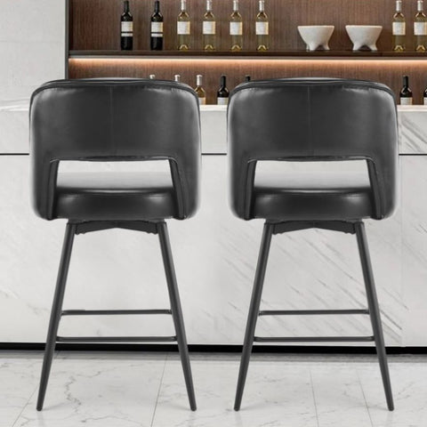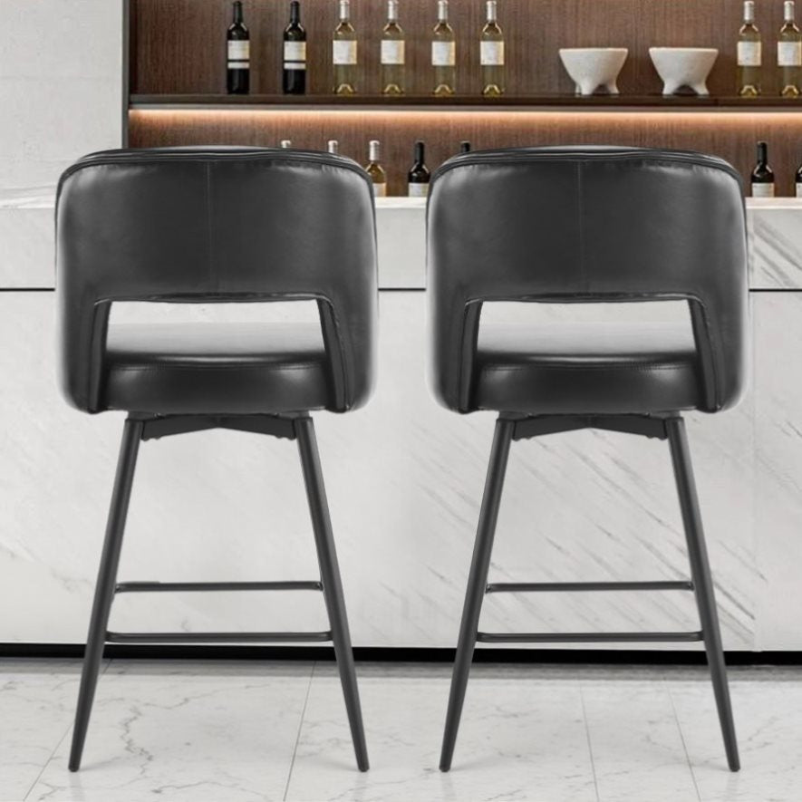 Introduce modern elegance to your space with this set of two black swivel bar stools, featuring a contemporary open backrest design. Upholstered in sleek black PU leather, these stools offer a perfect blend of style and easy maintenance. The unique cut-out backrest adds visual interest while providing essential support. Built with sturdy metal legs and a smooth 360-degree swivel mechanism, these stools ensure durability and effortless mobility. Ideal for enhancing your kitchen island, home bar, or commercial setting with a touch of sophisticated design.