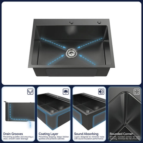 EFFECTIVE NOISE REDUCTION: The outer side of the sink's bottom is not only covered with sound-dampening pads but also sprayed with damp-proof paint coating to achieve the effect of noise reduction and moisture absorption, making the sink quieter to use and reducing condensation at the bottom of the sink.