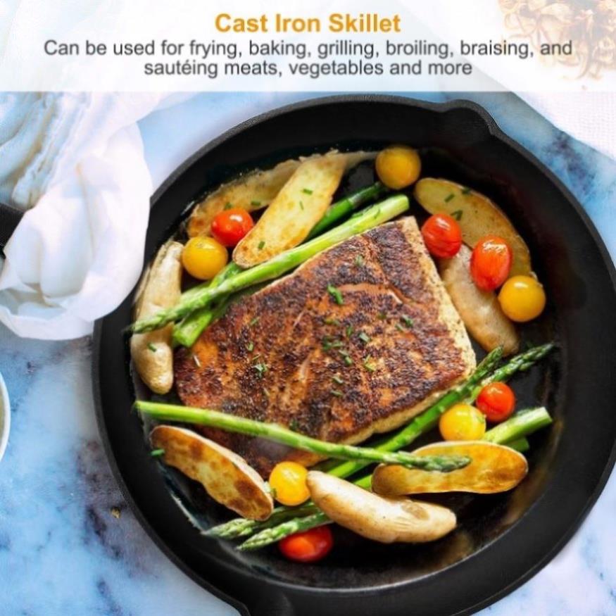 【Wide Application】- Cast-iron skillet can be used for frying, baking, grilling, broiling, braising, and sautéing meats, vegetables and more!