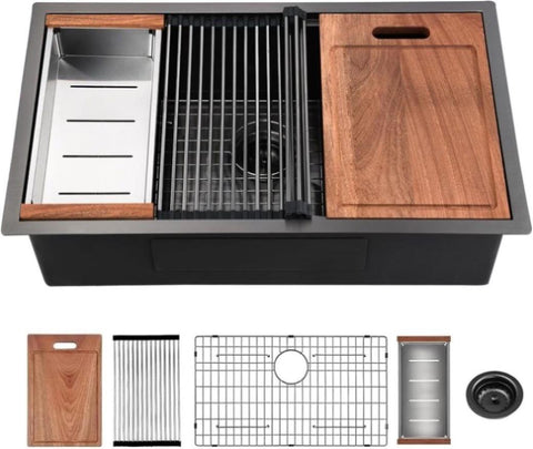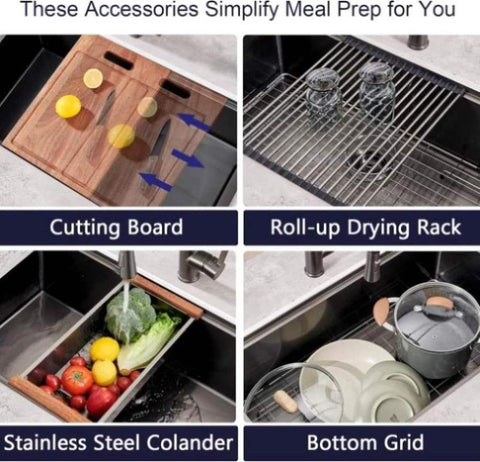 Package Includes: 32 gunmetal black stainless steel undermount workstation sink, colander, roll-up rack, bottom rinse grid, cutting board, basket strainer drain assembly, mounting clips, cut out template and installation instruction, the complete accessories meet your daily needs and bring great convenience to your life