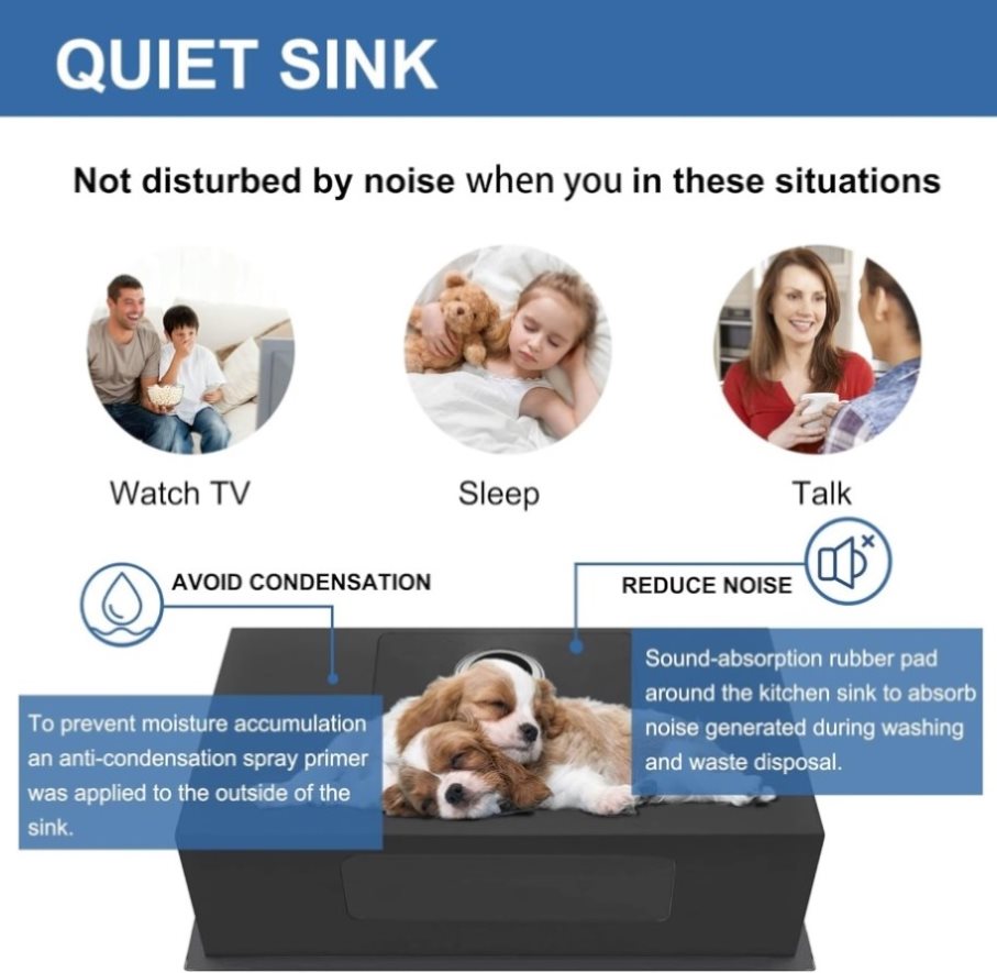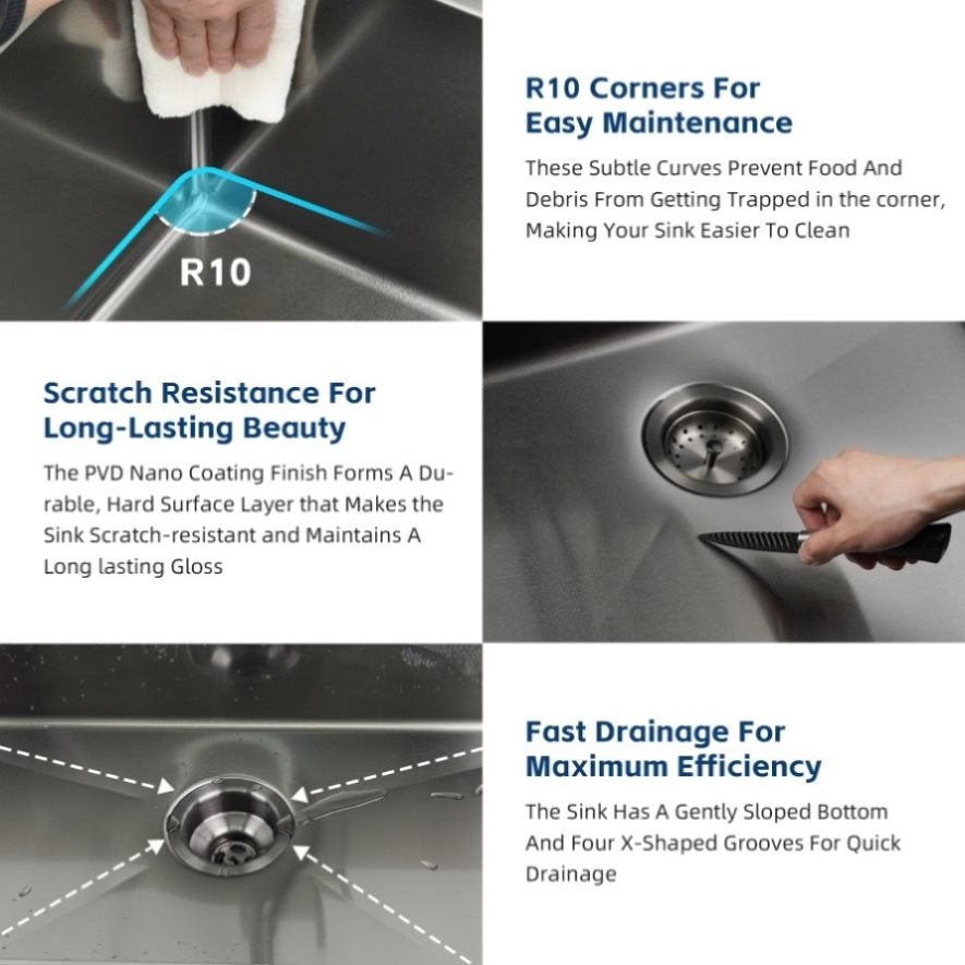Easy to Clean and Noise-Resistant: R10 rounded corners provide a stylish and modern appearance, make more easier to clean, food residues don't get stuck in the corners of the sink. The 3mm thick rubber pads and anti-condensation coating reduce noise while protecting your cabinets from damage, create a very comfortable kitchen environment for you
