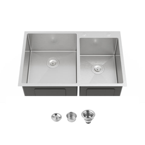 33"x19" Embedded Double Bowl Kitchen Sink, Overmount Handmade Sink in Brushed T3177P296190