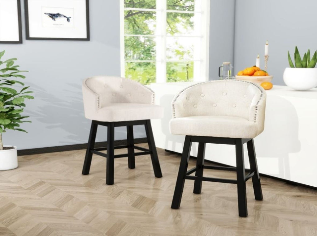 These comfortably soft barstools are a perfect transitional piece from your kitchen to your living room. Refined with a stunning nailhead trim and beautiful button-tufted seating, each barstool creates an exquisite contemporary appeal that brings incredible function to your kitchen nook or home bar. Our barstool set is complemented by a smooth rubberwood frame, creating a durable structure that ensures stability for you and your guests. Finished with a convenient 360-degree swivel function, this barstool offers a sophisticated design that enhances the style of any home.