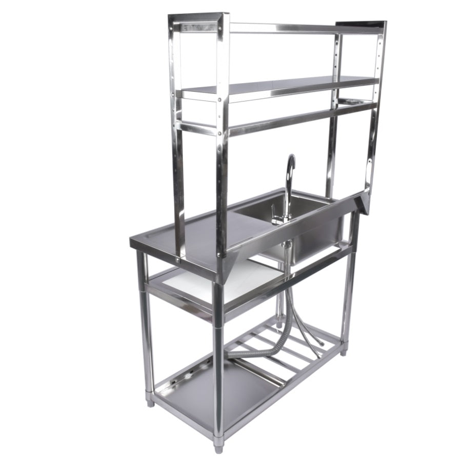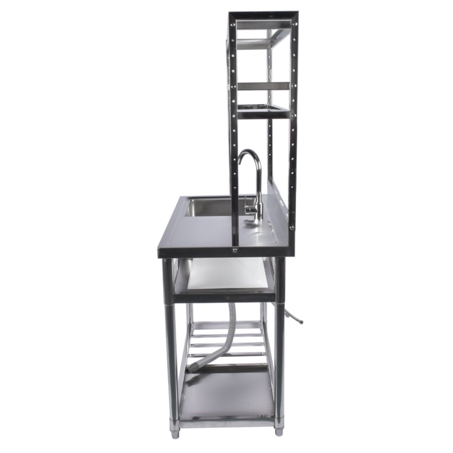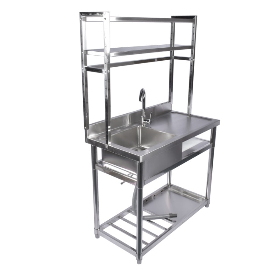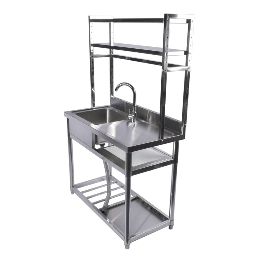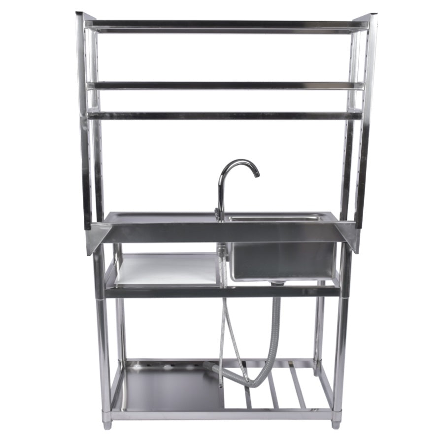 ▲HUMANIZED DESIGN: The four legs of this freestanding kitchen sink can be rotated to adjust the height (0-0.79 inches) to fit uneven floors and protect floors from scratches. The drain with removable strainer prevents food and debris from clogging and reduces odors.The height of the boards on the shelves away from the sink can be adjusted manually, to meet your height requirements