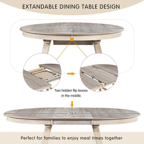 Round dining table set is ideal for small place. Featuring a modern farmhouse style and responsible quality wood, the tabletop will be a true staple in your dining room. This table has two hidden flip leaves in the middle. The length of this dining table is adjustable, it can be increased from 41.4" to 56.6".