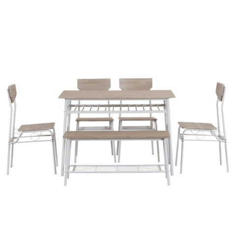 Upgrade your dining experience with this elegant and modern 6-Piece Dining Set, perfect for any home, kitchen, or dining room. This dining set includes a rectangular table, a bench, and four ergonomic chairs, comfortably accommodating your family meals. The set is designed with a sturdy steel frame and high-quality MDF board, ensuring stability and durability for years to come. Aesthetic design of the set brings warmth to your dining area, while the built-in storage racks underneath the table and bench offer convenient storage for your essentials. Easy to assemble and maintain, this dining set is a practical and stylish addition to your home.