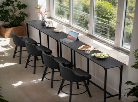 Upgrade your home bar or extra seating area with this sleek and durable single bar table!               Crafted with a high-density MDF tabletop in a black finish and a robust iron frame, this bar table balances style, sturdiness, and functionality to enhance any living space.               Measuring 180*38*99cm , it offers ample surface space for drinks, snacks, or even a laptop, while remaining compact enough for small apartments or cozy corners.               Equipped with built-in adjustable feet, it effortlessly adapts to uneven floors, preventing wobbling and ensuring stable use—perfect for casual gatherings or daily use.               The waterproof and scratch-resistant surface makes cleaning a breeze, and the neutral black tone complements various decor styles, from modern to rustic.               Whether you’re setting up a home bar, adding a counter to your kitchen island, or creating a functional workspace, this MDF and iron bar table is a reliable and stylish choice.​