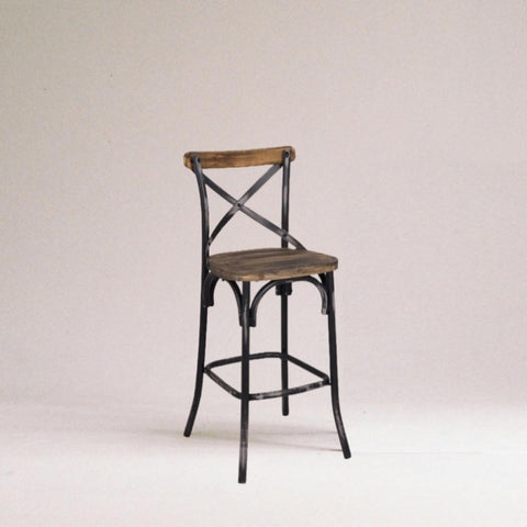 Vintage style bar chair in available in antique black & antique oak finish is made of wood and metal. Simple "X" backrest, wooden seat, slightly flared legs base with footrest support.