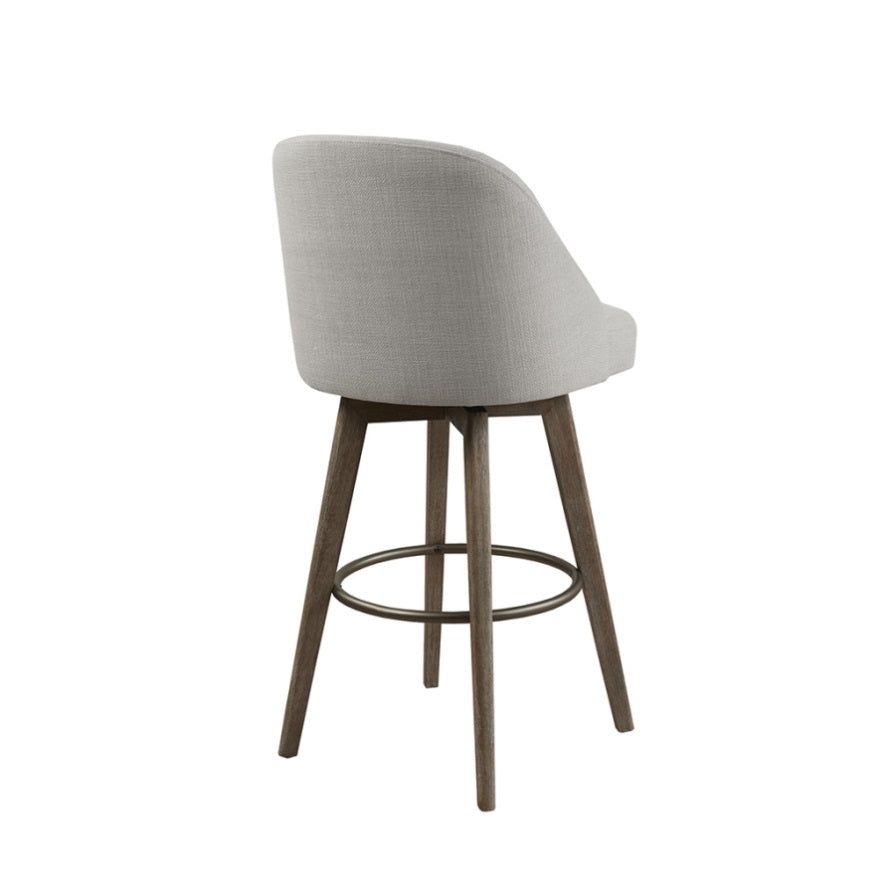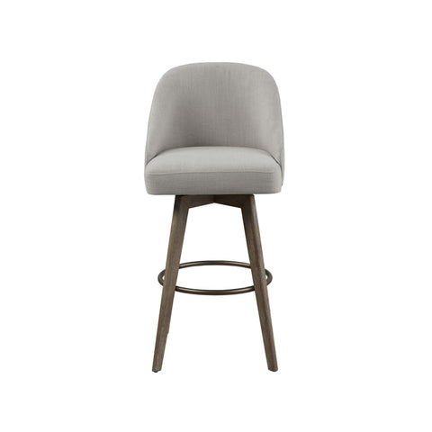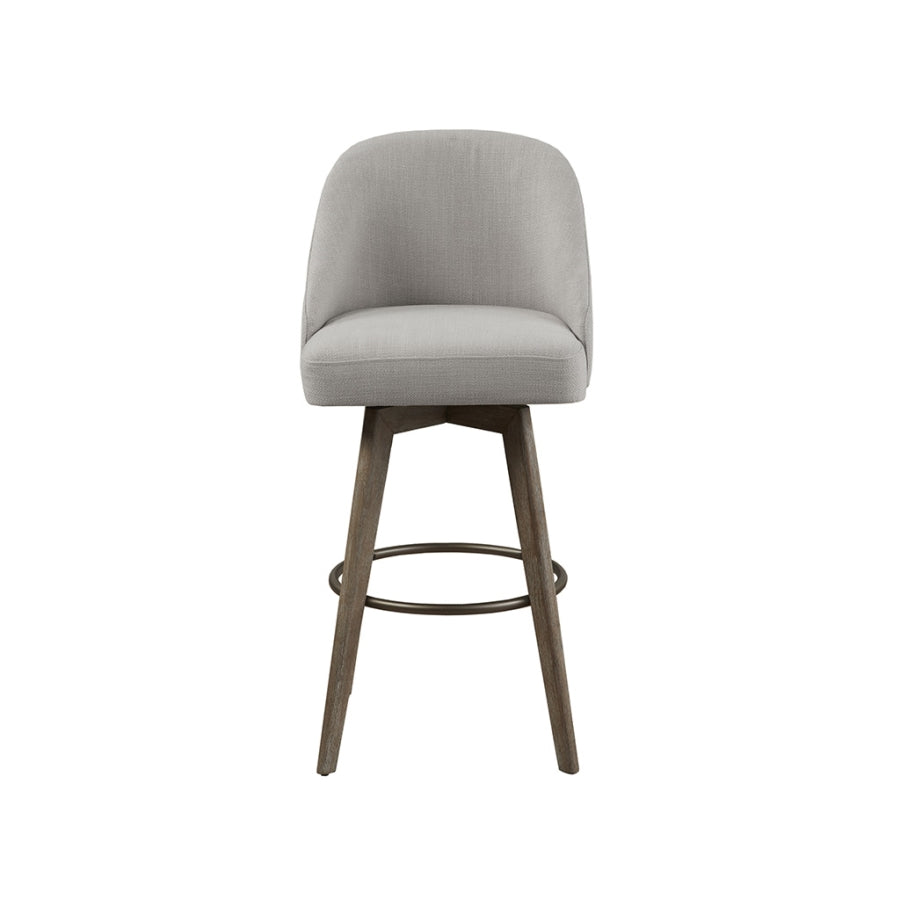 Beautifully crafted, the Madison Park Pearce Barstool with Swivel Seat introduces a perfect blend of simplicity and sophistication. This barrel style counter stool features a swivel function, allowing you to easily rotate the upholstered seat. A smooth reclaimed grey finish on the rubber wood legs creates a clean transitional look, while a matte metal ring provides the perfect footrest. The smooth and graceful curves of this counter stool form an elegant silhouette that adds a handsome touch to your dining room. Assembly is required. Max weight capacity: 300 lbs.