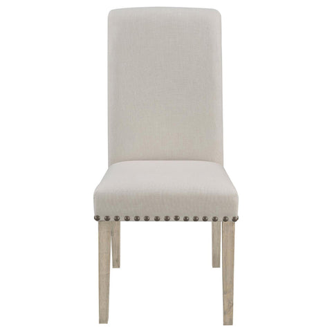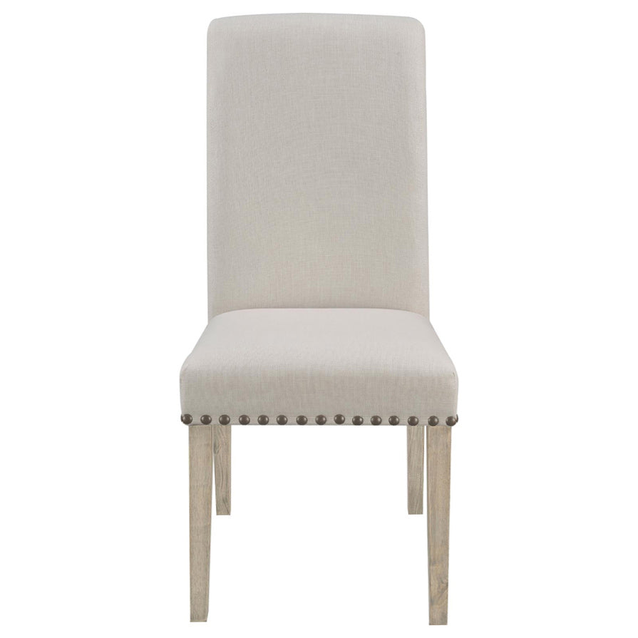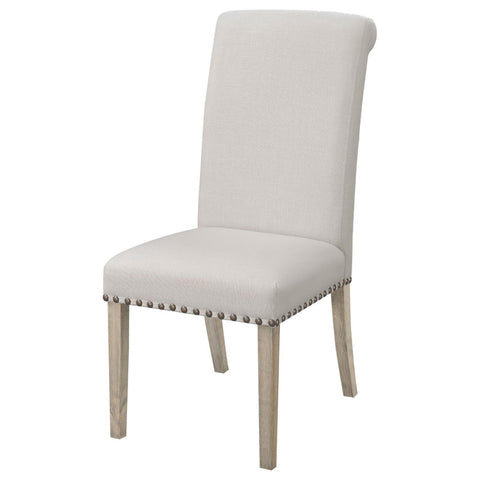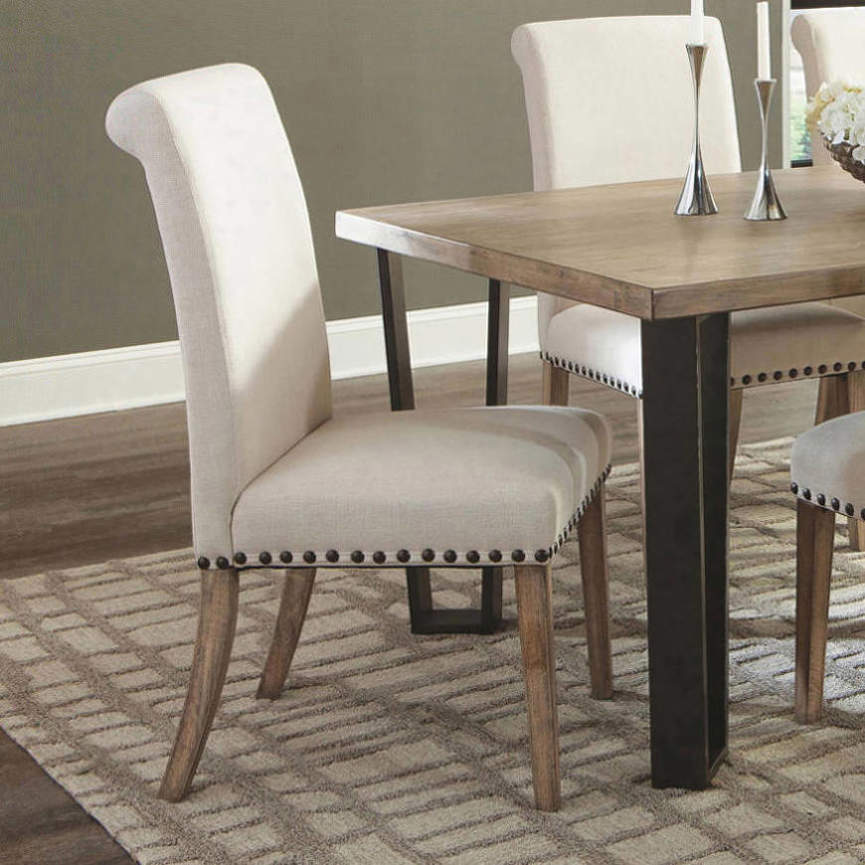 Enduring versatility is showcased in this rustic upholstered Parson's dining chair featuring a rolled-edge seat back. Combining classic nailhead trim with modern linen-like beige upholstery, each chair features a wood frame construction in a rustic pine finish that offers a warm, soothing touch.