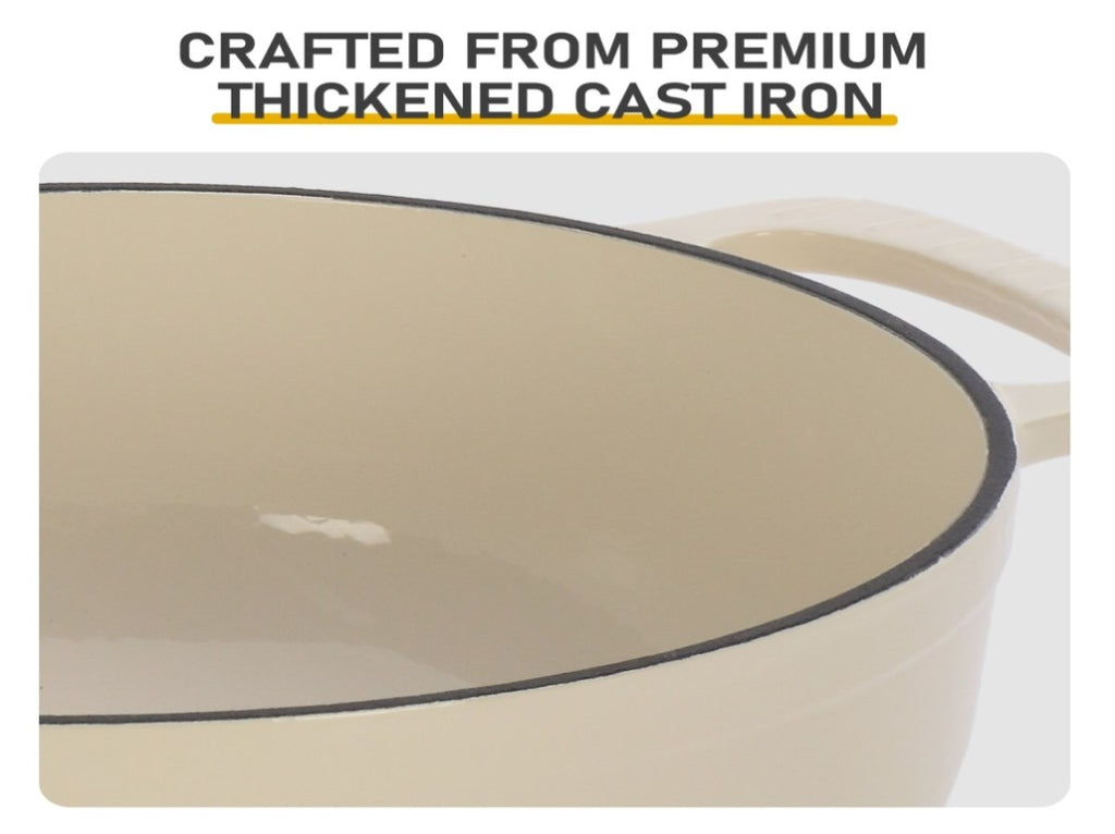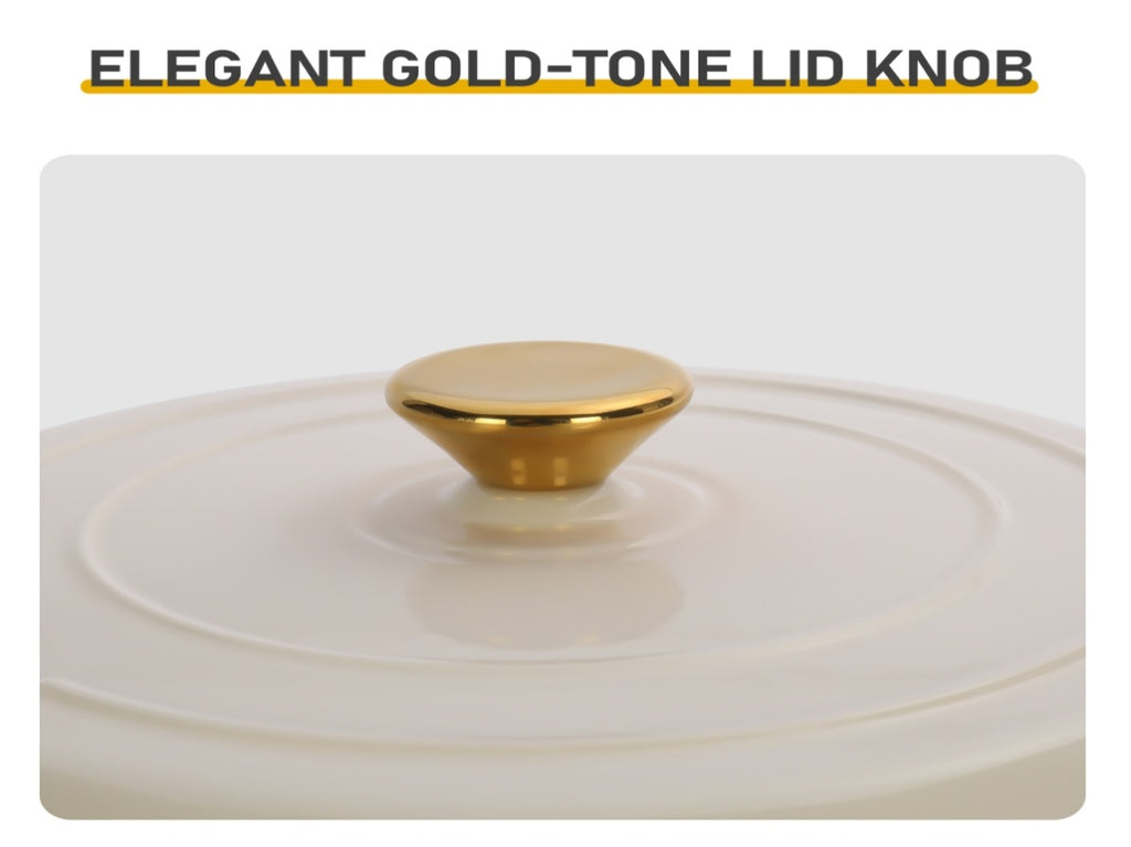 Elevate your culinary experience with this 6QT Enameled Cast Iron Dutch Oven in clean ceramic white – a versatile kitchen workhorse designed for home chefs and cooking enthusiasts alike. Crafted from premium cast iron with a smooth, durable enamel coating, it delivers exceptional heat retention and even distribution for perfectly braised meats, hearty stews, roasted veggies, and more. Compatible with all cooktops (gas, electric, ceramic, induction) and oven-safe up to 500°F ¹⁻⁴, this pot seamlessly transitions from stovetop to oven to table. The set includes two heat-resistant silicone oven mitts, providing safe handling during cooking and serving – combining functionality, style, and convenience in one essential cookware piece.Specifications