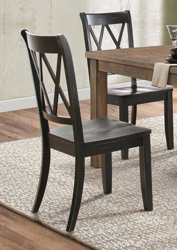 At home in a casual country setting, the Janina Collection allows for a customizable look to match the décor of your dining space. The black finish of the side chairs pine veneer complements its transitional double-x back design and allows for unique accent to your dining room.