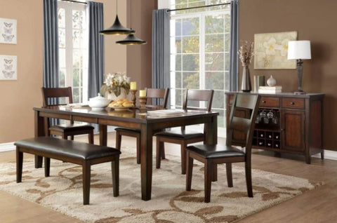 Transitionally styled for your home is the Mantello Collection. The benchs cherry finish over mango veneer and classic styling will provide the perfect seat for your mealtime gatherings. Dark brown faux leather covers the bench for complementing contrast to the woods finish.